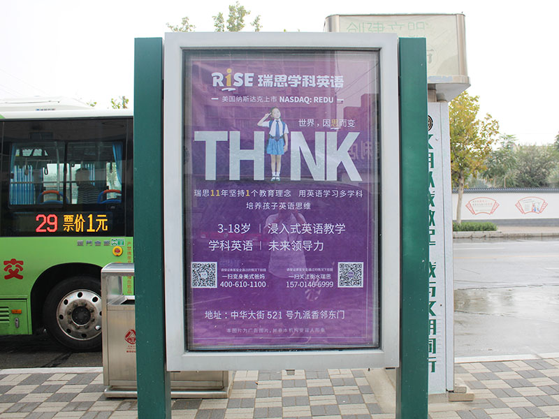 公交候車亭是鋼鐵噴塑結構,外觀線條流暢,造型現代,光亮潔凈,寬大玻璃,每個燈箱內裝有LED照明燈帶,夜晚畫面在燈光襯托下非常醒目。畫面距地面0.6米,且沒有遮擋物,為人體視覺*佳高度,畫面尺寸3.5*1.5米,且廣告畫面為正反兩面發布,有效廣告面積可達10平米以上,廣告效果極佳。無論是白天還是夜晚,候車亭燈箱廣告都會給人以強烈的視覺沖擊感。